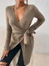 Our V-Neck Sweater ties at the side for a flattering fit and effortless style. With its asymmetrical hem and casual silhouette, this khaki knit is a versatile staple for everyday wear.